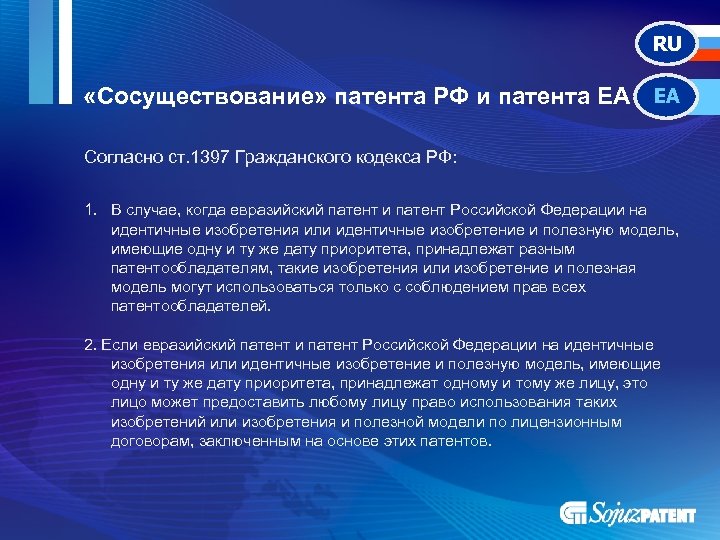 RU «Сосуществование» патента РФ и патента ЕА EA Согласно ст. 1397 Гражданского кодекса РФ: 1. В случае, когда евразийский патент и патент Российской Федерации на идентичные изобретения или идентичные изобретение и полезную модель, имеющие одну и ту же дату приоритета, принадлежат разным патентообладателям, такие изобретения или изобретение и полезная модель могут использоваться только с соблюдением прав всех патентообладателей. 2. Если евразийский патент и патент Российской Федерации на идентичные изобретения или идентичные изобретение и полезную модель, имеющие одну и ту же дату приоритета, принадлежат одному и тому же лицу, это лицо может предоставить любому лицу право использования таких изобретений или изобретения и полезной модели по лицензионным договорам, заключенным на основе этих патентов.