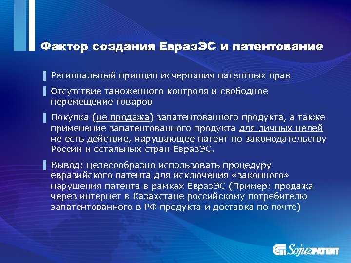 Фактор создания Евраз. ЭС и патентование ▐ Региональный принцип исчерпания патентных прав ▐ Отсутствие таможенного контроля и свободное перемещение товаров ▐ Покупка (не продажа) запатентованного продукта, а также применение запатентованного продукта для личных целей не есть действие, нарушающее патент по законодательству России и остальных стран Евраз. ЭС. ▐ Вывод: целесообразно использовать процедуру евразийского патента для исключения «законного» нарушения патента в рамках Евраз. ЭС (Пример: продажа через интернет в Казахстане российскому потребителю запатентованного в РФ продукта и доставка по почте)