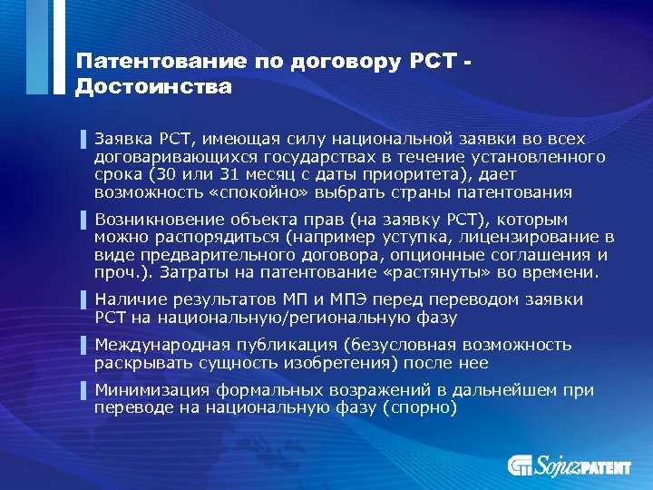 Патентование по договору РСТ Недостатки ▐ Увеличение сроков до получения патента в конкретной стране (т. е. до получения возможности защиты права на изобретение в этой стране) ▐ Увеличение общей стоимости патентования ▐ «Вспомогательный» статус результатов МП и МПЭ – экспертиза национального ведомства не связана ими ▐ Возможность конкурентов подать «близкие» заявки в период до публикации (будет противопоставление только по новизне и только в случае перевода на нац. фазу) или даже до фактического перевода на национальную фазу (известны факты выдачи патентов в таких случаях)