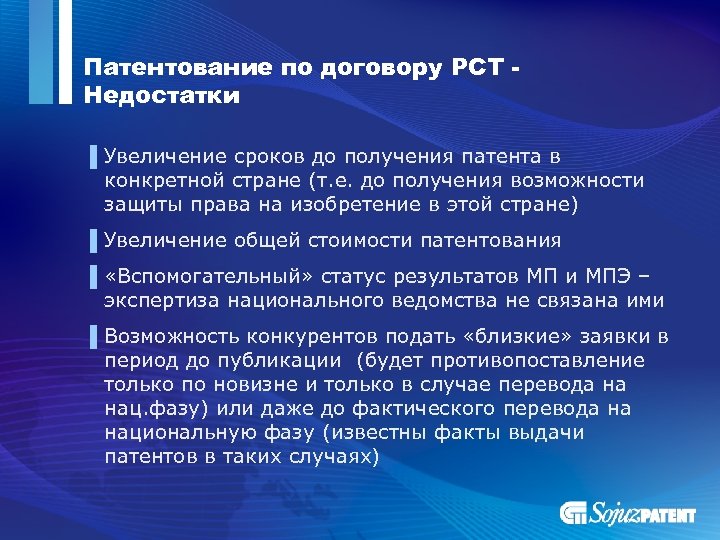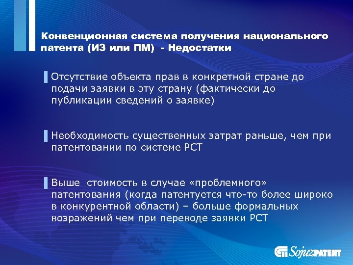 Конвенционная система получения национального патента (ИЗ или ПМ) - Недостатки ▐ Отсутствие объекта прав в конкретной стране до подачи заявки в эту страну (фактически до публикации сведений о заявке) ▐ Необходимость существенных затрат раньше, чем при патентовании по системе РСТ ▐ Выше стоимость в случае «проблемного» патентования (когда патентуется что-то более широко в конкурентной области) – больше формальных возражений чем при переводе заявки РСТ