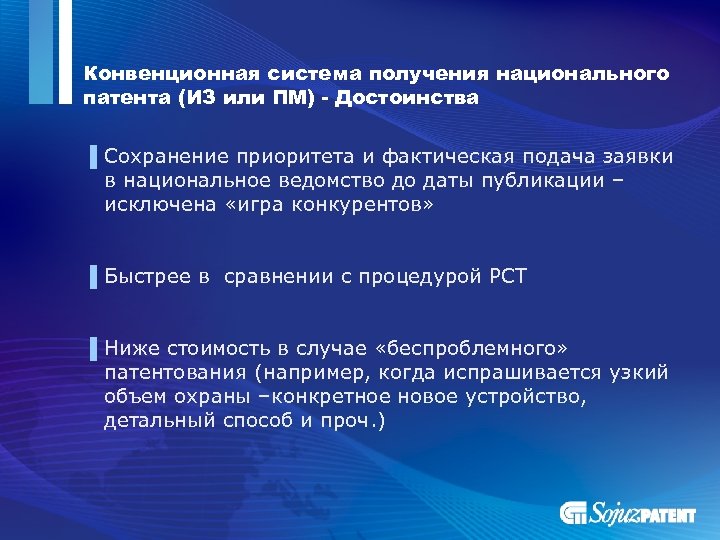 Конвенционная система получения национального патента (ИЗ или ПМ) - Достоинства ▐ Сохранение приоритета и фактическая подача заявки в национальное ведомство до даты публикации – исключена «игра конкурентов» ▐ Быстрее в сравнении с процедурой РСТ ▐ Ниже стоимость в случае «беспроблемного» патентования (например, когда испрашивается узкий объем охраны –конкретное новое устройство, детальный способ и проч. )