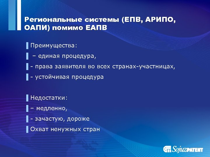 Региональные системы (ЕПВ, АРИПО, ОАПИ) помимо ЕАПВ ▐ Преимущества: ▐ – единая процедура, ▐ - права заявителя во всех странах-участницах, ▐ - устойчивая процедура ▐ Недостатки: ▐ – медленно, ▐ - зачастую, дороже ▐ Охват ненужных стран