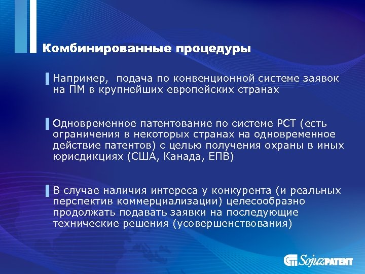 Комбинированные процедуры ▐ Например, подача по конвенционной системе заявок на ПМ в крупнейших европейских странах ▐ Одновременное патентование по системе РСТ (есть ограничения в некоторых странах на одновременное действие патентов) с целью получения охраны в иных юрисдикциях (США, Канада, ЕПВ) ▐ В случае наличия интереса у конкурента (и реальных перспектив коммерциализации) целесообразно продолжать подавать заявки на последующие технические решения (усовершенствования)