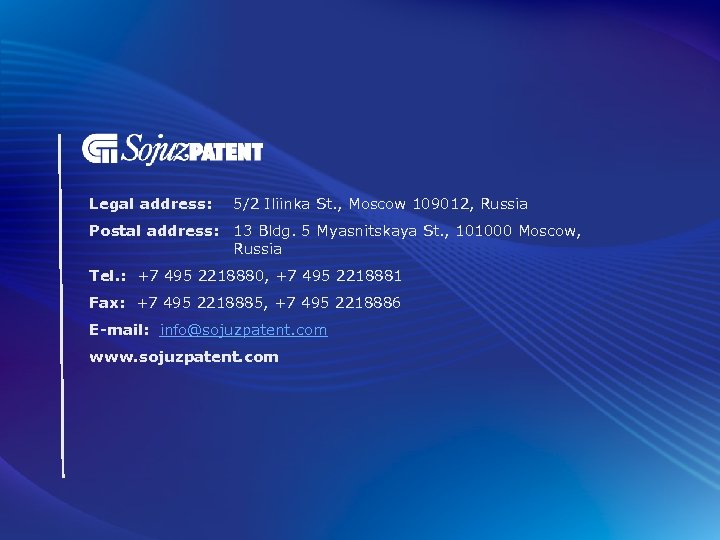 Legal address: 5/2 Iliinka St. , Moscow 109012, Russia Postal address: 13 Bldg. 5 Myasnitskaya St. , 101000 Moscow, Russia Tel. : +7 495 2218880, +7 495 2218881 Fax: +7 495 2218885, +7 495 2218886 E-mail: info@sojuzpatent. com www. sojuzpatent. com