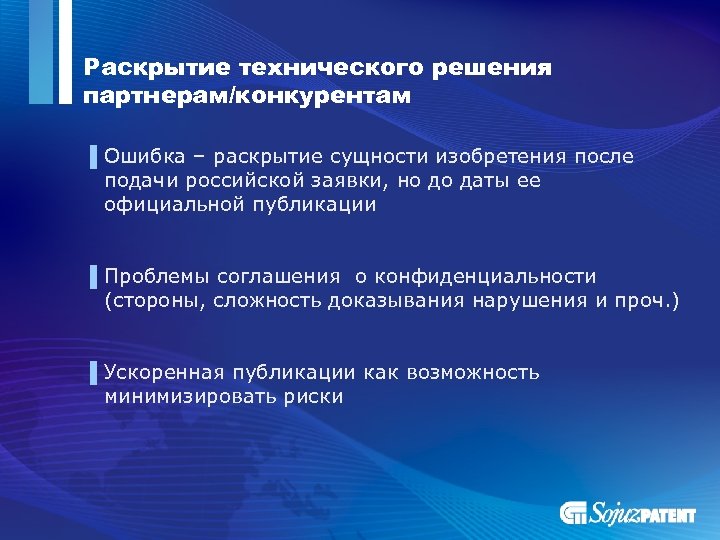 Раскрытие технического решения партнерам/конкурентам ▐ Ошибка – раскрытие сущности изобретения после подачи российской заявки, но до даты ее официальной публикации ▐ Проблемы соглашения о конфиденциальности (стороны, сложность доказывания нарушения и проч. ) ▐ Ускоренная публикации как возможность минимизировать риски