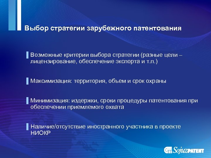 Выбор стратегии зарубежного патентования ▐ Возможные критерии выбора стратегии (разные цели – лицензирование, обеспечение экспорта и т. п. ) ▐ Максимизация: территория, объем и срок охраны ▐ Минимизация: издержки, сроки процедуры патентования при обеспечении приемлемого охвата ▐ Наличие/отсутствие иностранного участника в проекте НИОКР