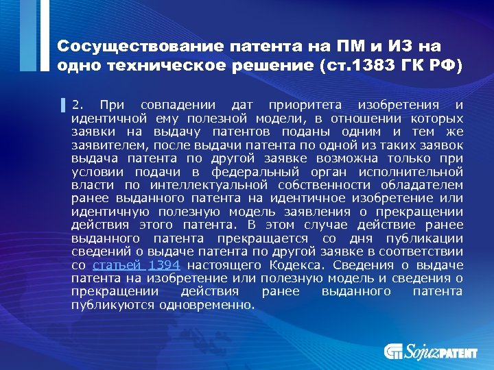 Сосуществование патента на ПМ и ИЗ на одно техническое решение (ст. 1383 ГК РФ) ▐ 2. При совпадении дат приоритета изобретения и идентичной ему полезной модели, в отношении которых заявки на выдачу патентов поданы одним и тем же заявителем, после выдачи патента по одной из таких заявок выдача патента по другой заявке возможна только при условии подачи в федеральный орган исполнительной власти по интеллектуальной собственности обладателем ранее выданного патента на идентичное изобретение или идентичную полезную модель заявления о прекращении действия этого патента. В этом случае действие ранее выданного патента прекращается со дня публикации сведений о выдаче патента по другой заявке в соответствии со статьей 1394 настоящего Кодекса. Сведения о выдаче патента на изобретение или полезную модель и сведения о прекращении действия ранее выданного патента публикуются одновременно.