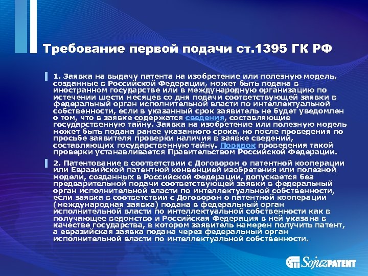 Требование первой подачи ст. 1395 ГК РФ ▐ 1. Заявка на выдачу патента на изобретение или полезную модель, созданные в Российской Федерации, может быть подана в иностранном государстве или в международную организацию по истечении шести месяцев со дня подачи соответствующей заявки в федеральный орган исполнительной власти по интеллектуальной собственности, если в указанный срок заявитель не будет уведомлен о том, что в заявке содержатся сведения, составляющие государственную тайну. Заявка на изобретение или полезную модель может быть подана ранее указанного срока, но после проведения по просьбе заявителя проверки наличия в заявке сведений, составляющих государственную тайну. Порядок проведения такой проверки устанавливается Правительством Российской Федерации. ▐ 2. Патентование в соответствии с Договором о патентной кооперации или Евразийской патентной конвенцией изобретения или полезной модели, созданных в Российской Федерации, допускается без предварительной подачи соответствующей заявки в федеральный орган исполнительной власти по интеллектуальной собственности, если заявка в соответствии с Договором о патентной кооперации (международная заявка) подана в федеральный орган исполнительной власти по интеллектуальной собственности как в получающее ведомство и Российская Федерация в ней указана в качестве государства, в котором заявитель намерен получить патент, а евразийская заявка подана через федеральный орган исполнительной власти по интеллектуальной собственности.
