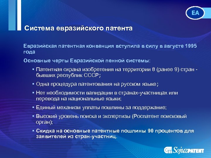 EA Система евразийского патента Евразийская патентная конвенция вступила в силу в августе 1995 года Основные черты Евразийской пенной системы: § Патентная охрана изобретения на территории 8 (ранее 9) стран бывших республик СССР; § Одна процедура патентования на русском языке; § Нет необходимости валидации в странах-участницах или перевода на национальные языки; § Единый механизм уплаты пошлины за поддержание; § Высокий уровень поиска и экспертизы (Роспатент поисковый орган); § Скидка на основные патентные пошлины 90 процентов для заявителей из стран-участниц.