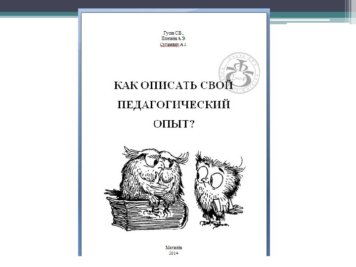 Литература 1. Богачева, И. В. Обобщение и представление опыта педагогической деятельности : метод. рек. / И. В. Богачева, И. В. Федоров, О. В. Сурикова; ГУО «Акад. последиплом. образования» . – Минск : АПО, 2012. – 92 с. 2. Запрудский, Н. И. Моделирование и проектирование авторских дидактических систем : пособие для учителя / Н. И. Запрудский. -Мн. , 336 с. – (Мастерская учителя). 3. Запрудский, Н. И. Педагогический опыт: обобщение и формы представления: пособие для учителя. /Н. И. Запрудский. – Мн. , 2014. - 256 с. 4. Запрудский, Н. И. Современные школьные технологии: Пособие для учителей. — 2 -е изд. / Н. И. Запрудский. — Мн. , 2004. — 288 е. — (Мастерская учителя). 5. Запрудский, Н. И. Современные школьные технологии– 2/ Н. И. Запрудский. — Мн. , 2010. — 256 с. — (Мастерская учителя). 6. Левитес Д. Г. Автодидактика Д. Г. Левитес. – М. , 2002. 7. Математика. Физика: как представить собственный педагогический опыт на квалификационном экзамене/ сост. : И. В. Богачева, И. В. Федоров. - Минск: Пачатковая школа, 2013. – 144 с. : ил. – (квалификационный экзамен). 8. Методические рекомендации по обобщению личного педагогического опыта// Сайт УО «АПО» [Электронный ресурс]. – 2014. – Режим доступа: http: //www. mirkatk. ru/index. php? option=com_content&view=article&id. – Дата доступа: 07. 04. 2014 9. Подласый И. П. Продуктивная педагогика И. П. Подласый. – М. , 2003. 10. Хуторской А. В. Современная дидактика А. В. Хуторской - М. , 2001. 11. Обобщение опыта педагогической деятельности// Сайт клуба юных физиков лицея БРУ/ ПЕДАГОГУ/ОБМЕН ОПЫТОМ/… [Электронный ресурс]. – 2014. – Режим доступа: http: //ufclub. moy. su/load/pedagogu/obmen_opytom/148. – Дата доступа: 25. 09. 2014.