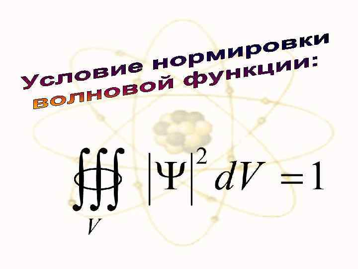 х Вероятность найти частицу в момент времени t в конечном объеме V, согласно теореме о сложении вероятностей, равна Т. к. |Ψ|2 dυ определяется как вероятность, то необходимо волновую функцию Ψ представить так, чтобы вероятность достоверного события обращалась в единицу, если за объем V принять бесконечный объем всего пространства. Это означает, что при данном условии частица должна находиться где-то в пространстве. Условия нормировки вероятностей: