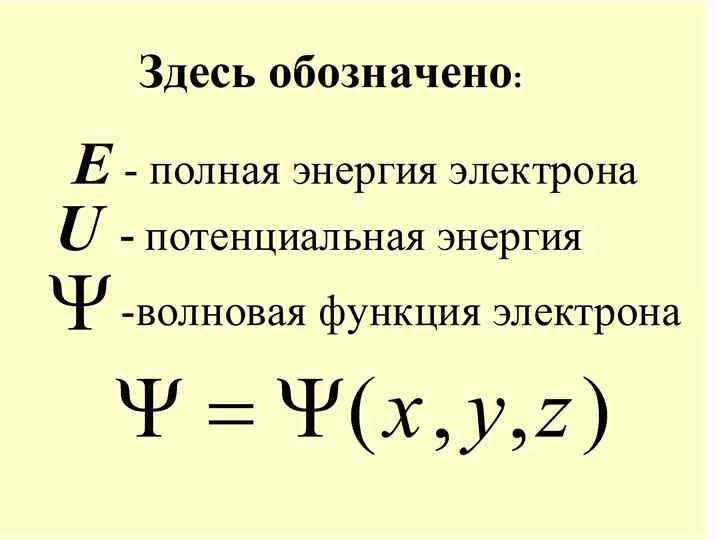 х Уравнение Шредингера записывается так: где в общем виде m – масса частицы, – оператор Лапласа i 2 – мнимая единица, U(x, y, z, t) – потенциальная энергия частицы в силовом поле, в котором она движется, Ψ – искомая волновая функция.