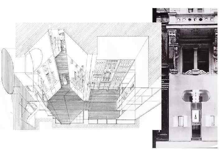 • Построенная в 1969 году в Нью-Йорке галерея Ричарда Р. Фейгена, по существу прямое продолжение темы крошечных венских магазинчиков. В проекте выгодно использованы казавшиеся неблагоприятными условия. На скромной улице, как будто критикуя архитектуру дыру, он построил белый, наивно простой, расчлененный только оконными проемами кулисообразный фасад со спаренными колоннами высотой на три этажа, облицованными зеркальным металлом.
