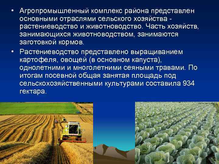 • Агропромышленный комплекс района представлен основными отраслями сельского хозяйства - растениеводство и животноводство. Часть хозяйств, занимающихся животноводством, занимаются заготовкой кормов. • Растениеводство представлено выращиванием картофеля, овощей (в основном капуста), однолетними и многолетними сеяными травами. По итогам посевной общая занятая площадь под сельскохозяйственными культурами составила 934 гектара.