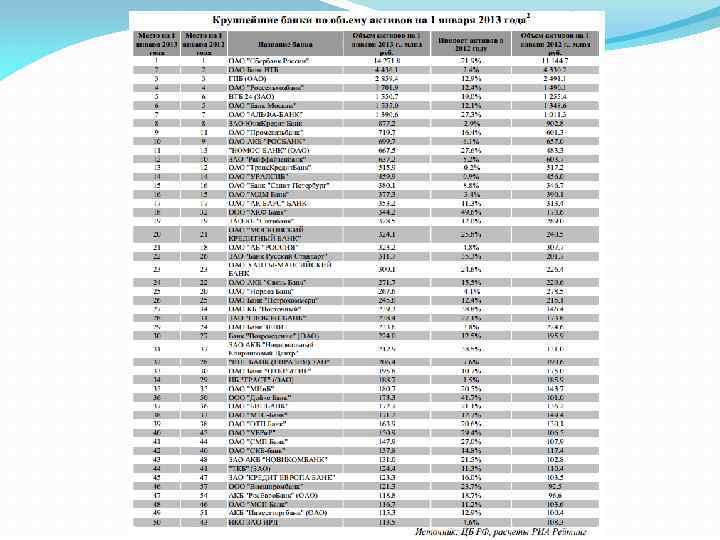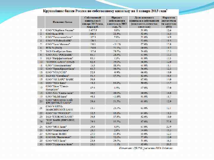 В 2012 году капитал российских банков вновь увеличился в меньшей степени, чем активы. За 2012 года собственные средства банков увеличились на 16. 6% до 6. 1 трлн руб. против роста активов на 19%. Согласно подготовленному экспертами РИА Рейтинг рэнкингу банков по размерам собственного капитала на 1 января 2013 года более 85% кредитных организаций увеличили его в течение 2012 года.
