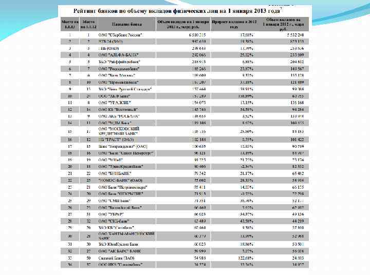 В 2012 году пассивы банковской системы России увеличились на 7. 88 трлн руб. в денежном эквиваленте. Собственные средства банковской отрасли выросли на 16. 6%, обязательства – на 19. 3%. В 2012 году банки установили рекорд по абсолютному объему привлеченных средств населения, объем вкладов вырос на 2. 38 трлн руб. Относительные темпы прироста депозитов населения оказались в 2012 году чуть ниже, чем в 2011 году – 20% против 21%, но во многом это было связано с укреплением рубля. Средняя сумма денежных средств на душу населения в банке составляет в России около 60 тыс. руб. , что является очень невысоким показателем даже по восточноевропейским меркам.