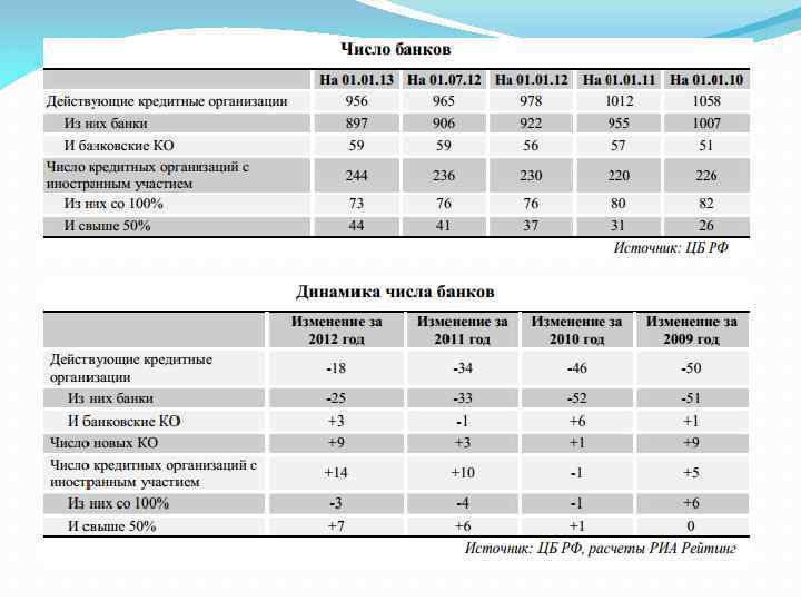 В 2012 году продолжилась тенденция сокращения числа действующих кредитных организаций. За 2012 год их количество уменьшилось на 22 единицы. При этом количество банков уменьшилось на 25 единиц. В 2012 году на рынок вышло девять новых кредитных организаций, что является рекордом со времен 2009 года. По прогнозу экспертов РИА Рейтинг, тенденция сокращения действующих кредитных организаций на рынке продолжится и даже несколько ускорится.