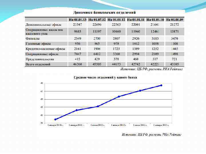 За 2012 год число банковских офисов в стране выросло на 3. 8% или на 1687 единиц. Темпы роста числа банковских офисов несколько упали в 2012 годом по сравнению с 2011 годом, когда количество банковских офисов увеличилось на 4. 5% или на 1931 единицу. Продолжает увеличиваться показатель среднего количества офисов на один банк. На 1 января 2013 года он составил 48. 5, что почти на три единицы больше, чем на 1 января 2012 года. В 2012 году в первую очередь увеличивалось количество таких типов банковских офисов как: дополнительные офисы, кредитно-кассовые офисы и операционные офисы.