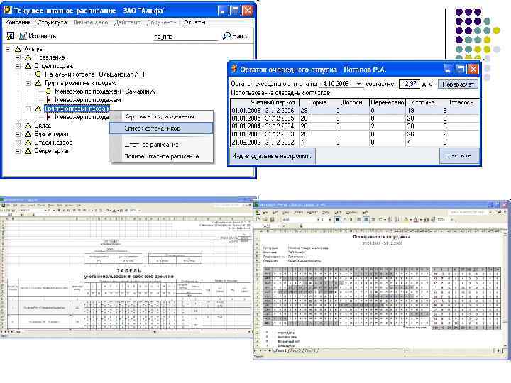 l Программный продукт «Кадры Плюс: Табель Сотрудников» предназначено для ведения учета рабочего времени сотрудниками организации и печать табелей. В программе предусмотрен механизм ведения личных карточек персонала, работающих по трудовым договорам, с указанием в них необходимых сведений о сотрудниках. Различные режимы: «уволен» , «архив» , «совместитель» и «кадровый резерв» и др. позволяют фильтровать список персонала организации и т. д. l Функциональные возможности программы «Сотрудники предприятия» (разработчик «Ara. XGroup» ) заключаются в: расчете отпусков и трудового стажа сотрудников организации, ведении учета рабочего времени, составлении личных карточек сотрудников с расширенным личностным и профессиональным учетом, получении фото сотрудника и изображений документов с web-камеры, формировании приказов и трудовых договоров, хранении изображения всех необходимых документов и т. д.