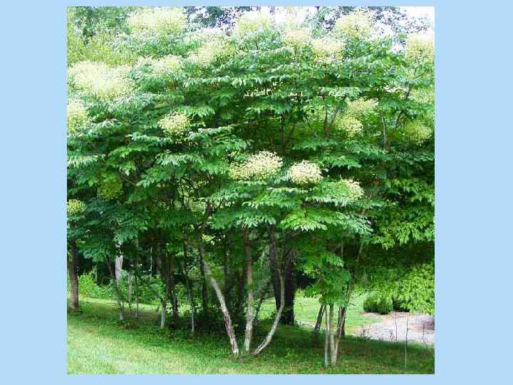 • Ботаническое описание. Небольшое дерево высотой до 6 мс поверхностной корневой системой (рис. 8. 7). Ствол прямой, неветвистый, усажен многочисленными крупными шипами. Листья длиной до 1 м и более, трижды перисто-сложные, горизонтально распростертые, длинночерешковые, тесно сближены около вершины ствола. Листочки сложного листа яйцевидной формы, с заостренной верхушкой и мелкозубчатым краем. Цветки мелкие, желтоватобелые, образуют простые зонтиковидные соцветия, собранные в несколько длинных густых метелок длиной до 45 см. Плоды - пятигнездные ценокарпные костянки, сине-черные, шаровидные, 3 -5 мм в диаметре. • Цветет в июне-августе, плоды созревают в октябре.