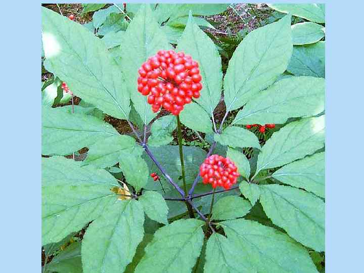 Ботаническое описание. Многолетнее травянистое растение до 80 см высотой, достигающее возраста 50 лет и более (рис. 8. 8). Корневище ( «шейка» ) тонкое, диаметром 0, 3 -1 см (у старых растений длиной до 15 см), со спирально расположенными рубцами от отмерших стеблей, спящими почками и зимующей покоящейся почкой ( «головка» ), а также придаточными корнями ( «дополнительные отростки» , или «дикари» ). Главный корень цилиндрический, с боковыми корнями ( «основные отростки» ) и многочисленными более тонкими «мочками» . Стебель одиночный, тонкий, на поперечном сечении цилиндрический, внутри полый, зеленый или буро-красный, иногда почти черный, заканчивающийся мутовкой из 2 -6 листьев. Листья длинночерешковые, трех- и пятипальчато-сложные; листочки заостренно-эллиптические или обратнояйцевидные, голые, по краю пильчатые. Из центра мутовки выходит один цветонос высотой до 10 (редко до 30) см, заканчивающийся простым зонтиком из бледно-зеленых пятичленных цветков с нижней двугнездной завязью. Плод - красная ценокарпная костянка. Семена неправильно округлые, шероховатые, светло-желтые. Цветет в июне-июле, плоды созревают в августе. Размножается семенами.