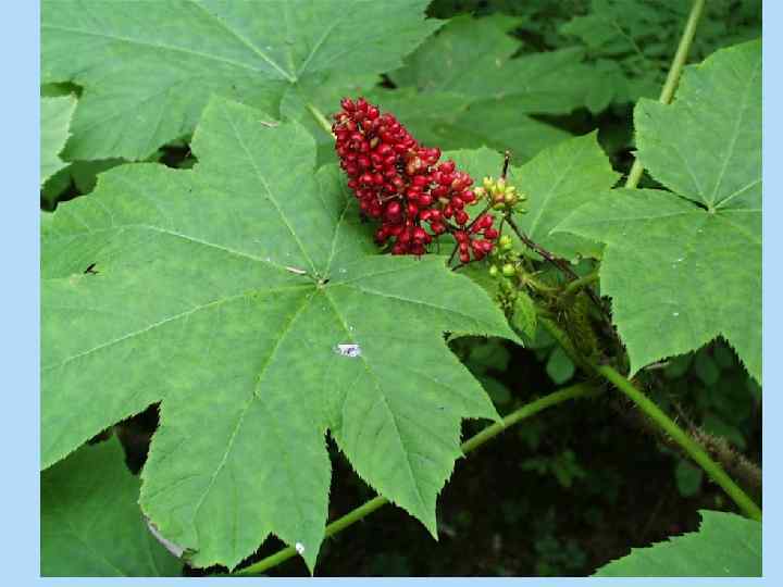 • Ботаническое описание. Кустарник 1 -1, 5 м в высоту (рис. 8. 9). Побеги густо усажены длинными игольчатыми шипами. Восходящие полегающие стебли укореняются, напоминают подземные корневища. Листья очередные, простые, округлые в очертании, пятисемилопастные, на длинных черешках, покрытых желтоватыми ломкими шипиками. Край листовых пластинок с острыми двойными зубцами и бахромкой из шиповатых волосков, пластинка листа сверху ярко-зеленая, морщинистая, снизу более светлая. Цветки мелкие, зеленоватые, в простых зонтиковидных соцветиях, образующих метельчатый поникающий тирс. Плод - ярко-оранжевая костянка. • Цветет в июне-июле, плоды созревают в августе-сентябре. • Географическое распространение. Заманиха высокая произрастает на юге Приморского края. Встречается вдоль побережья Японского моря на протяжении 420 км.