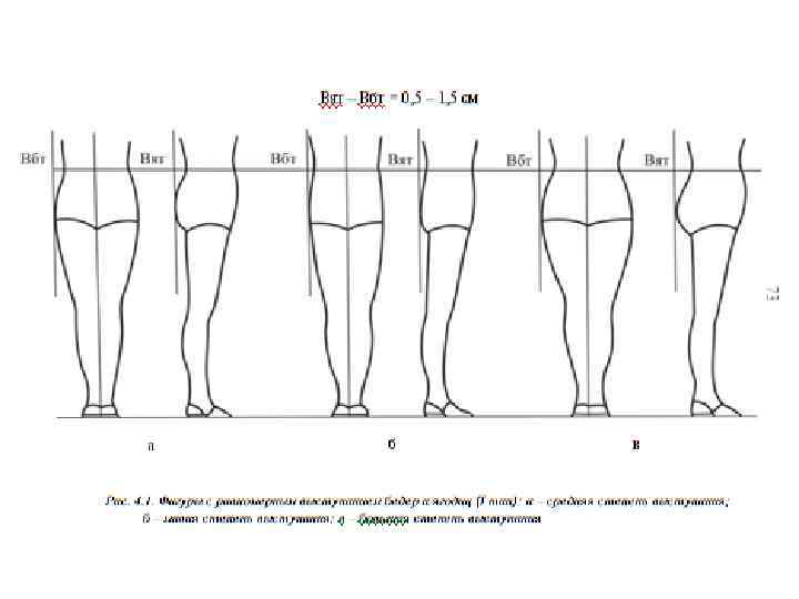 В зависимости от характера выступания бедер и ягодиц относительно талии в сравнении друг с другом выделено три типа телосложения женских фигур в поясной части: I-й тип телосложения: фигуры с равномерным выступанием бедер и ягодиц относительно талии. У этих фигур ягодицы выступают относительно талии примерно на 1, 0 см (или 1, 0÷ 0, 5 см) больше, чем бедра. Фигуры этого типа могут иметь одну из трех, но одноименную степень выступания ягодиц и бедер: • среднюю – при Вят = 5, 0÷ 6, 0 см и Вбт = 4, 0÷ 5, 0 см (см. рис. 4. 1 а); • малую – при Вят < 5, 0 см и Вбт < 4, 0 см (см. рис. 4. 1 б); • большую – при Вят > 6, 0 см и Вбт > 5, 0 см (см. рис. 4. 1 в). Эти фигуры могут иметь разный по форме и степени выступания относительно талии живот. У фигур больших размеров и с малой степенью выступания ягодиц и бока, просто жировые отложения откладываются сбоку-сзади, создавая наполненность на этом участке тела.