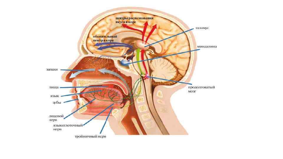 АНОМАЛИИ ВКУСОВОЙ ЧУВСТВИТЕЛЬНОСТИ Ø Агевзия- потеря вкуса или вкусового восприятия. Ø Гипогевзия- пониженная способность к восприятию вкуса. Ø Гипергевзия- повышенная вкусовая чувствительность. Ø Фантогевзия- ощущение какого-то определенного вкуса — сладкого, кислого, соленого, металлического или иного неприятного вкуса в отсутствие реальной стимуляции полости рта. Ø Дисгевзия- нарушение восприятия вкуса, при котором вещество с приятным вкусом кажется невкусным.