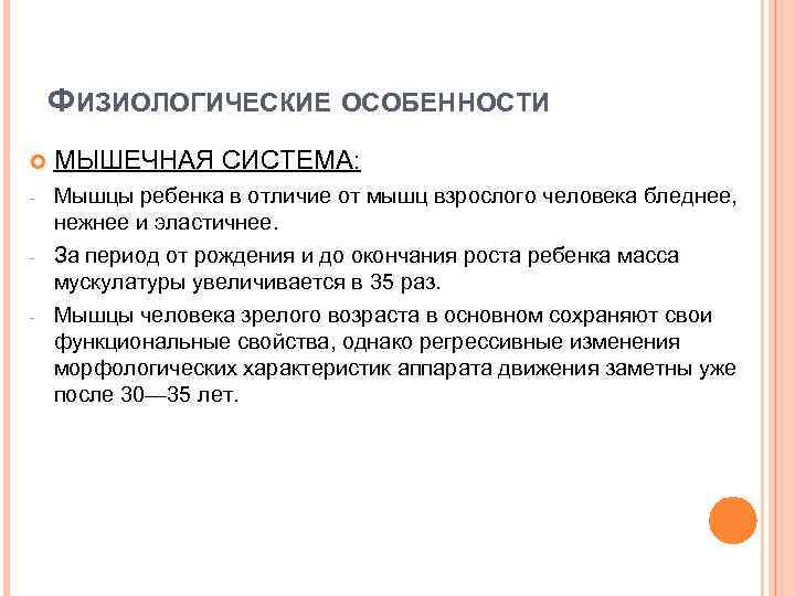 ФИЗИОЛОГИЧЕСКИЕ ОСОБЕННОСТИ МЫШЕЧНАЯ СИСТЕМА: - Мышцы ребенка в отличие от мышц взрослого человека бледнее, нежнее и эластичнее. За период от рождения и до окончания роста ребенка масса мускулатуры увеличивается в 35 раз. Мышцы человека зрелого возраста в основном сохраняют свои функциональные свойства, однако регрессивные изменения морфологических характеристик аппарата движения заметны уже после 30— 35 лет. - -