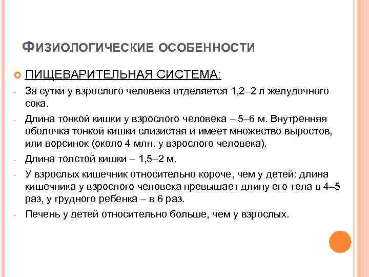 ФИЗИОЛОГИЧЕСКИЕ ОСОБЕННОСТИ ПИЩЕВАРИТЕЛЬНАЯ СИСТЕМА: - За сутки у взрослого человека отделяется 1, 2– 2 л желудочного сока. Длина тонкой кишки у взрослого человека – 5– 6 м. Внутренняя оболочка тонкой кишки слизистая и имеет множество выростов, или ворсинок (около 4 млн. у взрослого человека). Длина толстой кишки – 1, 5– 2 м. У взрослых кишечник относительно короче, чем у детей: длина кишечника у взрослого человека превышает длину его тела в 4– 5 раз, у грудного ребенка – в 6 раз. Печень у детей относительно больше, чем у взрослых. - - -
