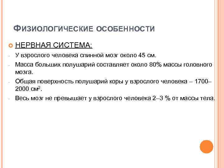 ФИЗИОЛОГИЧЕСКИЕ ОСОБЕННОСТИ НЕРВНАЯ СИСТЕМА: - У взрослого человека спинной мозг около 45 см. - Масса больших полушарий составляет около 80% массы головного мозга. Общая поверхность полушарий коры у взрослого человека – 1700– 2000 см 2. Весь мозг не превышает у взрослого человека 2– 3 % от массы тела. - -