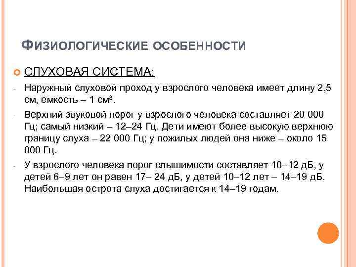 ФИЗИОЛОГИЧЕСКИЕ ОСОБЕННОСТИ СЛУХОВАЯ СИСТЕМА: - Наружный слуховой проход у взрослого человека имеет длину 2, 5 см, емкость – 1 см 3. Верхний звуковой порог у взрослого человека составляет 20 000 Гц; самый низкий – 12– 24 Гц. Дети имеют более высокую верхнюю границу слуха – 22 000 Гц; у пожилых людей она ниже – около 15 000 Гц. У взрослого человека порог слышимости составляет 10– 12 д. Б, у детей 6– 9 лет он равен 17– 24 д. Б, у детей 10– 12 лет – 14– 19 д. Б. Наибольшая острота слуха достигается к 14– 19 годам. - -