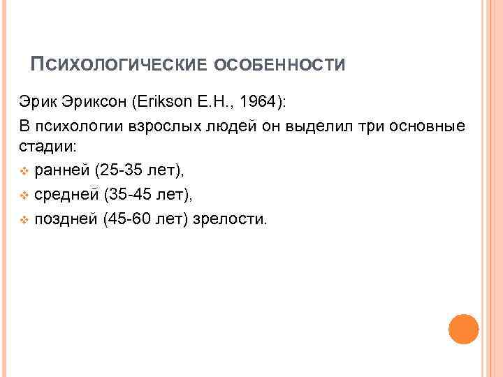 ПСИХОЛОГИЧЕСКИЕ ОСОБЕННОСТИ Эриксон (Erikson E. H. , 1964): В психологии взрослых людей он выделил три основные стадии: v ранней (25 -35 лет), v средней (35 -45 лет), v поздней (45 -60 лет) зрелости.