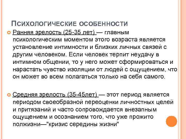 ПСИХОЛОГИЧЕСКИЕ ОСОБЕННОСТИ Ранняя зрелость (25 -35 лет) — главным психологическим моментом этого возраста является установление интимности и близких личных связей с другим человеком. Если человек терпит неудачу в интимном общении, то у него может сформироваться и нарастать чувство изоляции от людей с ощущением, что он может во всем полагаться только на себя самого. Средняя зрелость (35 -45 лет) — этот период является периодом своеобразной переоценки личностных целей и притязаний и часто сопровождается внезапным ощущением и осознанием того, что уже прожито полжизни—"кризис середины жизни"