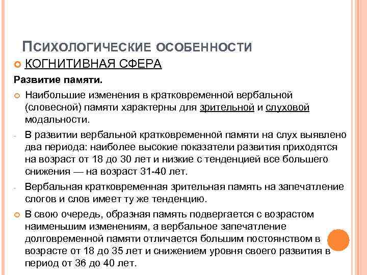 ПСИХОЛОГИЧЕСКИЕ ОСОБЕННОСТИ КОГНИТИВНАЯ СФЕРА Развитие памяти. Наибольшие изменения в кратковременной вербальной (словесной) памяти характерны для зрительной и слуховой модальности. - В развитии вербальной кратковременной памяти на слух выявлено два периода: наиболее высокие показатели развития приходятся на возраст от 18 до 30 лет и низкие с тенденцией все большего снижения — на возраст 31 -40 лет. - Вербальная кратковременная зрительная память на запечатление слогов и слов имеет ту же тенденцию. В свою очередь, образная память подвергается с возрастом наименьшим изменениям, а вербальное запечатление долговременной памяти отличается большим постоянством в возрасте от 18 до 35 лет и снижением уровня своего развития в период от 36 до 40 лет.