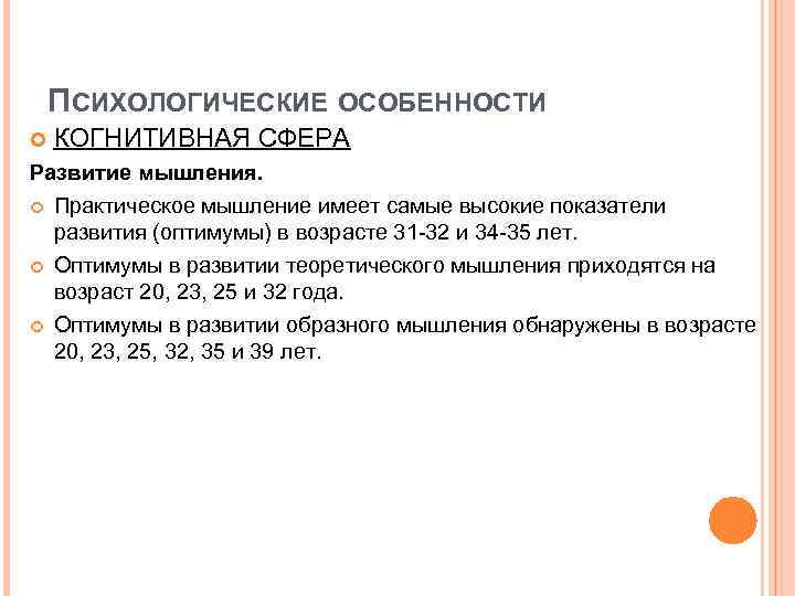 ПСИХОЛОГИЧЕСКИЕ ОСОБЕННОСТИ КОГНИТИВНАЯ СФЕРА Развитие мышления. Практическое мышление имеет самые высокие показатели развития (оптимумы) в возрасте 31 -32 и 34 -35 лет. Оптимумы в развитии теоретического мышления приходятся на возраст 20, 23, 25 и 32 года. Оптимумы в развитии образного мышления обнаружены в возрасте 20, 23, 25, 32, 35 и 39 лет.