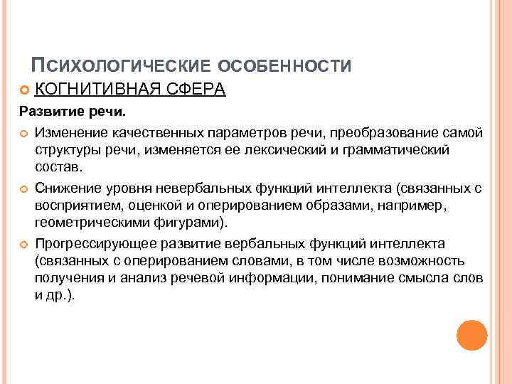 ПСИХОЛОГИЧЕСКИЕ ОСОБЕННОСТИ КОГНИТИВНАЯ СФЕРА Развитие речи. Изменение качественных параметров речи, преобразование самой структуры речи, изменяется ее лексический и грамматический состав. Снижение уровня невербальных функций интеллекта (связанных с восприятием, оценкой и оперированием образами, например, геометрическими фигурами). Прогрессирующее развитие вербальных функций интеллекта (связанных с оперированием словами, в том числе возможность получения и анализ речевой информации, понимание смысла слов и др. ).
