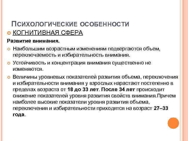 ПСИХОЛОГИЧЕСКИЕ ОСОБЕННОСТИ КОГНИТИВНАЯ СФЕРА Развитие внимания. Наибольшим возрастным изменениям подвергаются объем, переключаемость и избирательность внимания. Устойчивость и концентрация внимания существенно не изменяются. Величины уровневых показателей развития объема, переключения и избирательности внимания у взрослых нарастают постепенно в пределах возраста от 18 до 33 лет. После 34 лет происходит снижение показателей уровня развития свойств внимания. Причем наиболее высокие показатели уровня развития объема, переключения и избирательности приходятся на возраст 27– 33 года.