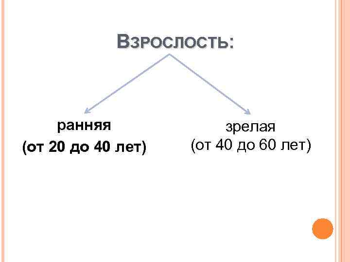 ВЗРОСЛОСТЬ: ранняя (от 20 до 40 лет) зрелая (от 40 до 60 лет)