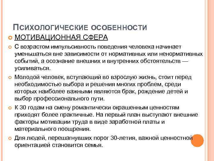 ПСИХОЛОГИЧЕСКИЕ ОСОБЕННОСТИ МОТИВАЦИОННАЯ СФЕРА С возрастом импульсивность поведения человека начинает уменьшаться вне зависимости от нормативных или ненормативных событий, а осознание внешних и внутренних обстоятельств — усиливаться. Молодой человек, вступающий во взрослую жизнь, стоит перед необходимостью выбора и решения многих проблем, среди которых наиболее важными являются брак, рождение детей и выбор профессионального пути. К 30 годам на смену романтически окрашенным ценностям приходят более практичные. На первый план выступают внешние факторы мотивации труда в виде заработной платы и материального поощрения. Для людей, перешагнувших порог 30 -летия, важной ценностной ориентацией становится семья.