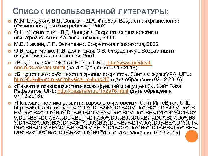 СПИСОК ИСПОЛЬЗОВАННОЙ ЛИТЕРАТУРЫ: М. М. Безруких, В. Д. Сонькин, Д. А. Фарбер. Возрастная физиология: (Физиология развития ребенка), 2002. О. Н. Московченко, Л. Д. Ченцова. Возрастная физиология и психофизиология. Конспект лекций, 2008. М. В. Савчин, Л. П. Василенко. Возрастная психология, 2006. О. В. Скрипченко, Л. В. Долинская, З. В. Огородничук. Возрастная и педагогическая психология, 2001. «Возраст» . Сайт Medical-Enc. ru. URL: http: //www. medicalenc. ru/3/vozrast. shtml (дата обращения 02. 12. 2016). «Возрастные особенности в зрелом возрасте» . Сайт Физкульт. УРА. URL: http: //fizkult-ura. ru/sci/physical_culture/15 (дата обращения 02. 12. 2016). «Развитие психофизиологических функций и ощущений» . Сайт База Рефератов. URL: http: //bazarefer. ru/1 x 2 e 76. html (дата обращения 07. 12. 2016). «Психодиагностика развития взрослого человека» . Сайт Инте. Вики. URL: http: //wiki. iteach. ru/images/d/d 6/%D 0%9 F%D 1%81%D 0%B 8%D 1%85%D 0%B E%D 0%B 4%D 0%B 8%D 0%B 0%D 0%B 3%D 0%BD%D 0%BE%D 1%81%D 1%82 %D 0%B 8%D 0%BA%D 0%B 0_%D 1%80%D 0%B 7%D 0%B 2%D 0%B 8 %D 1%82%D 0%B 8%D 1%8 F_%D 0%B 2%D 0%B 7%D 1%80%D 0%BE%D 1%81% D 0%BB%D 0%BE%D 0%B 3%D 0%BE_%D 1%87%D 0%B 5%D 0%BB%D 0%BE% D 0%B 2%D 0%B 5%D 0%BA%D 0%B 0. pdf (дата обращения 07. 12. 2016)