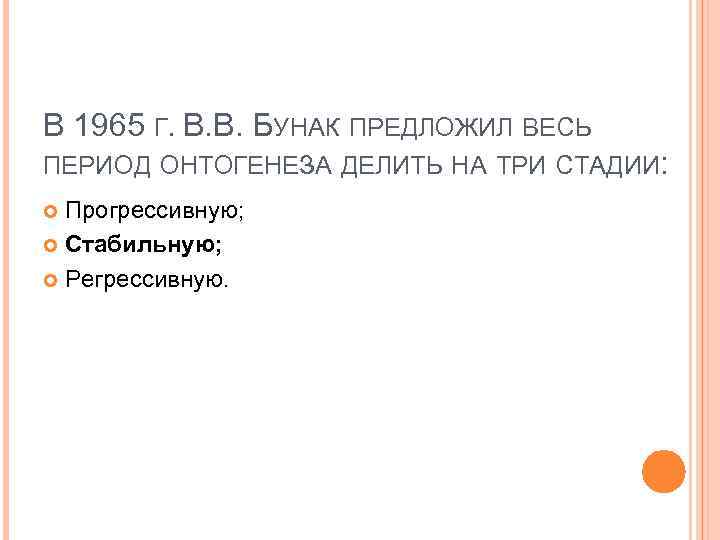 В 1965 Г. В. В. БУНАК ПРЕДЛОЖИЛ ВЕСЬ ПЕРИОД ОНТОГЕНЕЗА ДЕЛИТЬ НА ТРИ СТАДИИ: Прогрессивную; Стабильную; Регрессивную.
