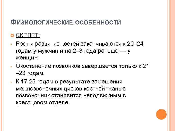 ФИЗИОЛОГИЧЕСКИЕ ОСОБЕННОСТИ - - - СКЕЛЕТ: Рост и развитие костей заканчиваются к 20– 24 годам у мужчин и на 2– 3 года раньше — у женщин. Окостенение позвонков завершается только к 21 – 23 годам. К 17 -25 годам в результате замещения межпозвоночных дисков костной тканью позвоночник становится неподвижным в крестцовом отделе.