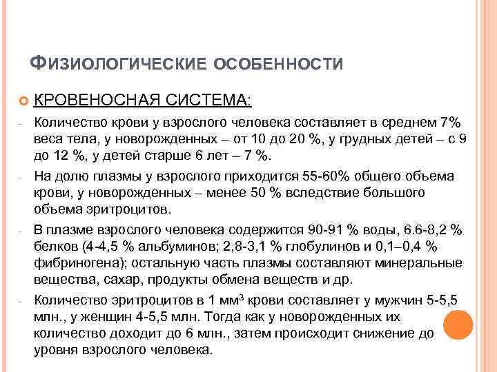ФИЗИОЛОГИЧЕСКИЕ ОСОБЕННОСТИ КРОВЕНОСНАЯ СИСТЕМА: - Количество крови у взрослого человека составляет в среднем 7% веса тела, у новорожденных – от 10 до 20 %, у грудных детей – с 9 до 12 %, у детей старше 6 лет – 7 %. На долю плазмы у взрослого приходится 55 -60% общего объема крови, у новорожденных – менее 50 % вследствие большого объема эритроцитов. В плазме взрослого человека содержится 90 -91 % воды, 6. 6 -8, 2 % белков (4 -4, 5 % альбуминов; 2, 8 -3, 1 % глобулинов и 0, 1– 0, 4 % фибриногена); остальную часть плазмы составляют минеральные вещества, сахар, продукты обмена веществ и др. Количество эритроцитов в 1 мм 3 крови составляет у мужчин 5 -5, 5 млн. , у женщин 4 -5, 5 млн. Тогда как у новорожденных их количество доходит до 6 млн. , затем происходит снижение до уровня взрослого человека. - - -
