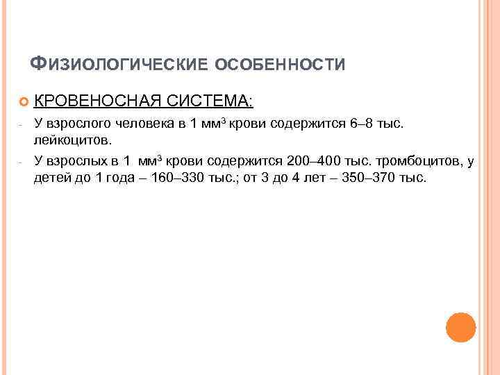 ФИЗИОЛОГИЧЕСКИЕ ОСОБЕННОСТИ КРОВЕНОСНАЯ СИСТЕМА: - У взрослого человека в 1 мм 3 крови содержится 6– 8 тыс. лейкоцитов. У взрослых в 1 мм 3 крови содержится 200– 400 тыс. тромбоцитов, у детей до 1 года – 160– 330 тыс. ; от 3 до 4 лет – 350– 370 тыс. -