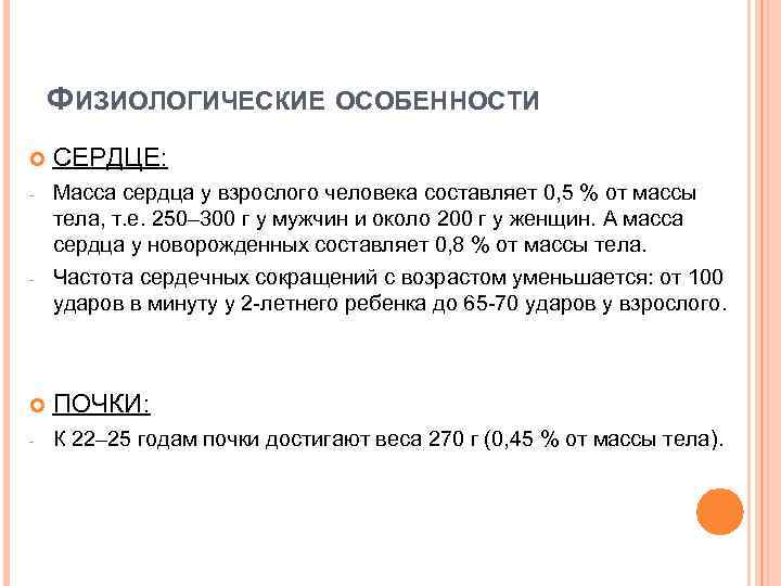 ФИЗИОЛОГИЧЕСКИЕ ОСОБЕННОСТИ СЕРДЦЕ: - Масса сердца у взрослого человека составляет 0, 5 % от массы тела, т. е. 250– 300 г у мужчин и около 200 г у женщин. А масса сердца у новорожденных составляет 0, 8 % от массы тела. Частота сердечных сокращений с возрастом уменьшается: от 100 ударов в минуту у 2 -летнего ребенка до 65 -70 ударов у взрослого. - ПОЧКИ: - К 22– 25 годам почки достигают веса 270 г (0, 45 % от массы тела).