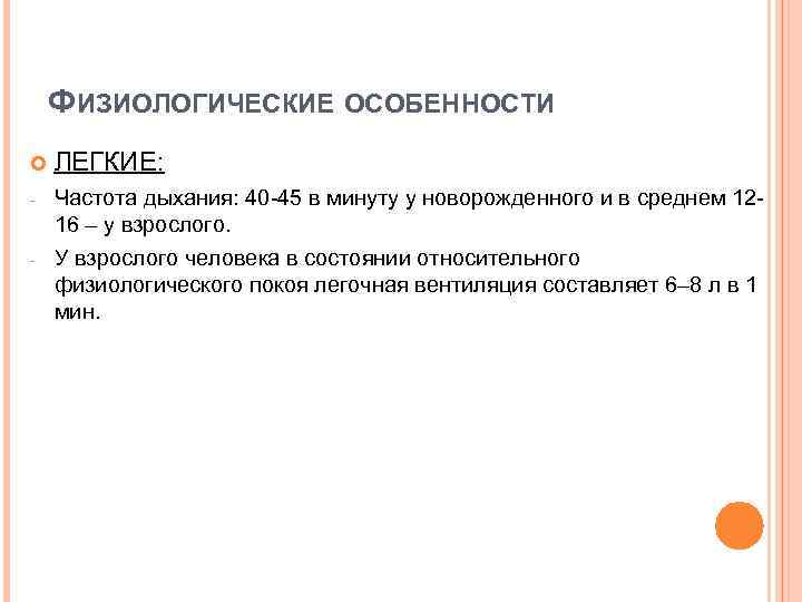 ФИЗИОЛОГИЧЕСКИЕ ОСОБЕННОСТИ ЛЕГКИЕ: - Частота дыхания: 40 -45 в минуту у новорожденного и в среднем 1216 – у взрослого. У взрослого человека в состоянии относительного физиологического покоя легочная вентиляция составляет 6– 8 л в 1 мин. -