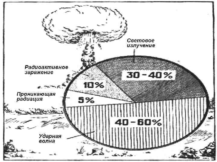 Световое излучение ядерного взрыва излучение в короткий промежуток времени огромного количества энергии, видимого света и близких к нему по спектру ультрафиолетовых и инфракрасных лучей, вследствие чего происходит быстрый нагрев облучаемых предметов, обугливание или воспламенение горючих материалов и ожог живых тканей; основным параметром, характеризующим поражающее действие светового излучения, является световой импульс. Световой импульс количество световой энергии, падающей на 1 м 2 освещаемой поверхности, перпендикулярной к направлению излу чения, за все время свечения области взрыва (огненного шара); в си стеме СИ измеряется в Дж/м 2, внесистемная единица кал/см 2 (1 кал/см 2 = 42 Дж/м 2). Поглощенная световая энергия светового импульса преоб разуется в тепловую, вызывает нагрев, воспламенение или разрушение элемента объекта.