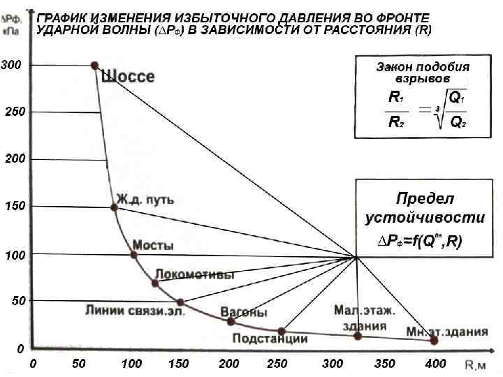 ЗАКОН ПОДОБИЯ ВЗРЫВОВ Общеобязательное правило, доказанное научно и экспериментально, применяемое для одного вида взрывоопасных материалов и однородной среды и утверждающее, что отношение расстояний с одинаковым избыточным давлением во фронте ударной волны от двух отличающихся по мощности, но одинаковых по виду взрывов (R) прямо пропорционально корню кубическому из отношений из массы (Q). Закон позволяет определить зависимость изменения избыточного давления во фронте ударной волны для любой массы взрывоопасного материала на любом удалении от центра взрыва, если это избыточное давление во фронте ударной волны известно для другой массы взрывоопасного материала; по нему также могут определяться безопасные расстояния до взрывоопасных объектов, мест погрузки, транспортирования, выгрузки и хранения ВМ, путей стоянки вагонов с ОГ и ликвидации аварийных ситуаций с ними.