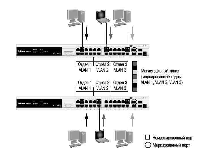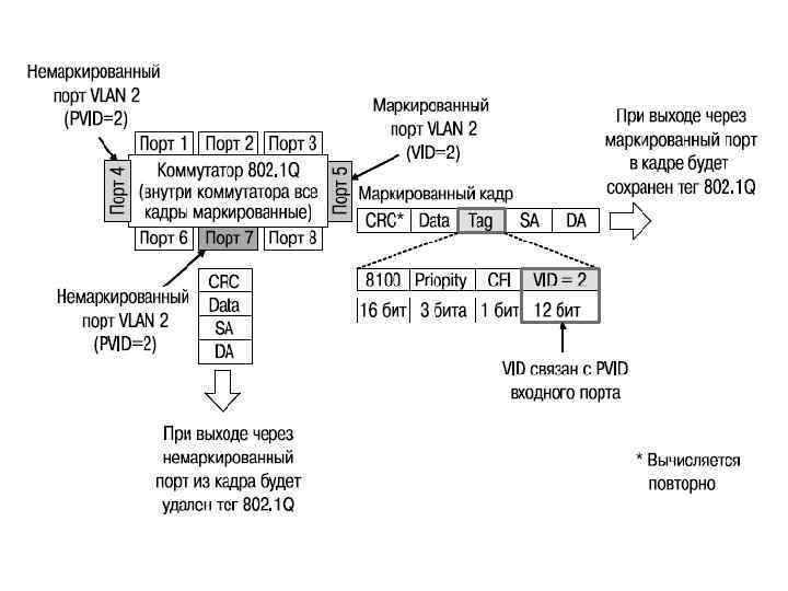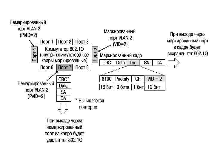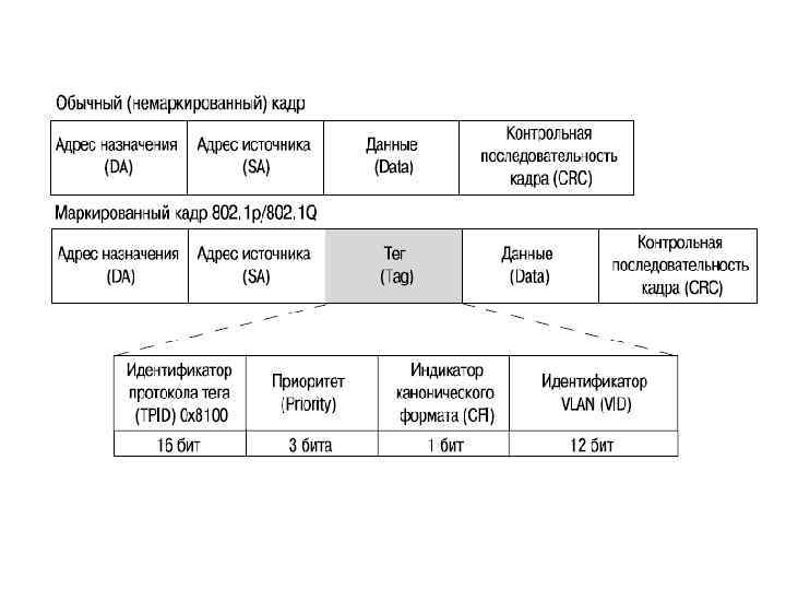 VLAN на базе меток – стандарт IEEE 802. 1 Q Стандарт IEEE 802. 1 Q определяет изменения в структуре кадра Ethernet, позволяющие передавать информацию о VLAN по сети. Метод организации VLAN на основе меток – тэгов, использует дополнительные поля кадра для хранения информации о принадлежности кадра при его перемещениях между коммутаторами сети.